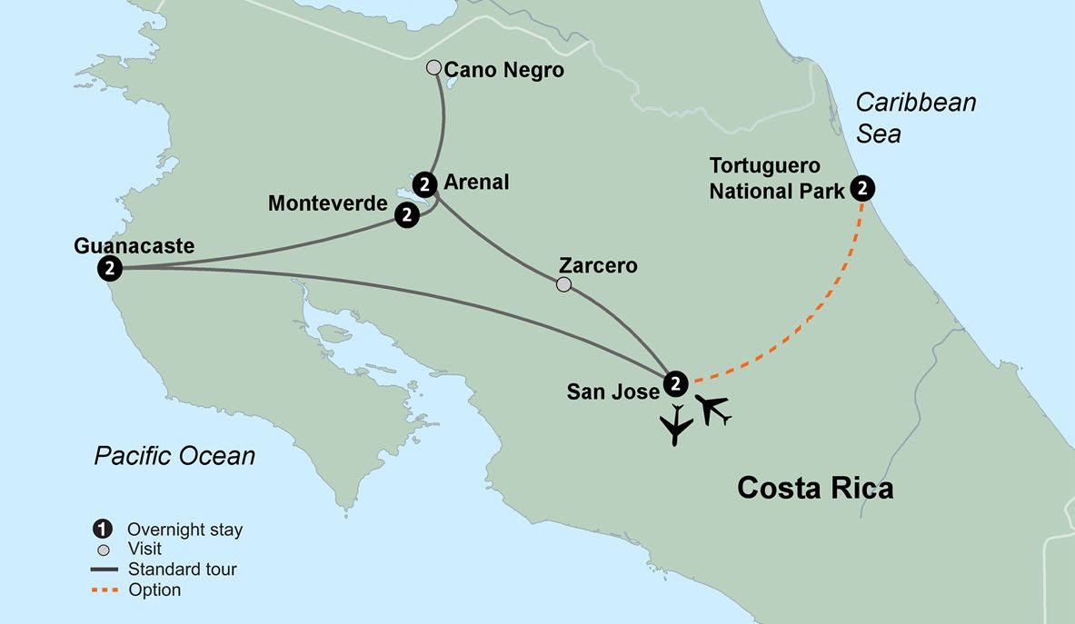 A coffee plantation visit, a trip to the Arenal Volcano, a Cano Negro cruise on a "panga", guided nature walk in the Cloud Forest, choice of Hanging Bridges or Ziplining in the Cloud Forest, Zarcero's Topiary Garden, Plaza de Cultura, the National Theatre, a cooking demonstration, an afternoon and evening in Samara, a tour of San Jose, and more.